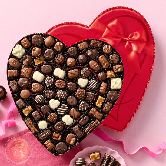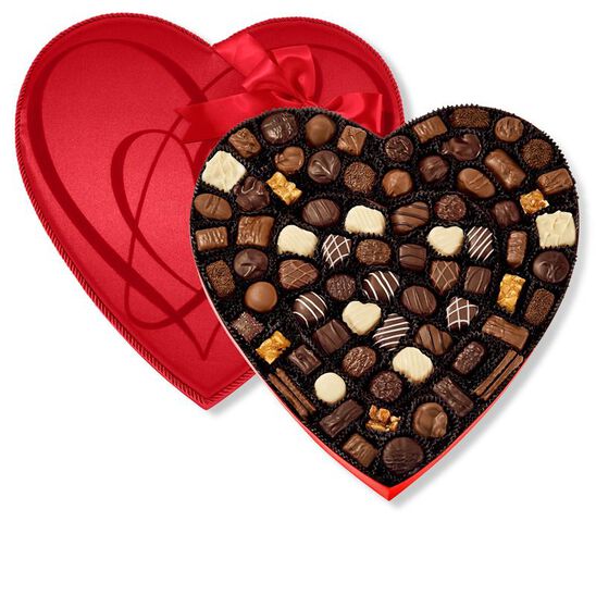 Treat your Valentine to the ultimate chocolate experience. Over three pounds of See’s premium chocolates, truffles, buttercreams and caramels come beautifully arranged in a striking red heart-shaped box for a truly unforgettable gift. Approximately 75 pieces*: Café Hazelnut Truffle (2), Dark Normandie® (2), Milk Vanilla Buttercream, Milk Bordeaux™ (2), Milk Chocolate Buttercream, Milk Mocha (3), Milk Coconut Cream, Milk Divinity (2), Milk Mayfair®, Blueberry Truffle (2), Light Chocolate Truffle (2), Milk Butterscotch Square, Milk Rum Nougat, Milk California Brittle®, Milk Almond Square (2), Milk Molasses Chips (4), Milk Almond Caramel (3), Milk Almonds (2), Dark Chocolate Buttercream, Dark Scotchmallow® (3), Dark Butterchew®, Dark Almond Nougat (2), Dark Caramel Pattie (2), Dark Almonds (2), Dark Walnut Square (3), Key Lime Truffle (3), Divinity Puff, Cashew Brittle (2), Milk Butterchew® (2), Milk Chelsea, Dark Coconut Cream, Pineapple Truffle (3), Dark Chocolate Truffle (2), Dark Chocolate Chip Truffle (3), Raspberry Truffle (2), Café Au Lait Truffle (2), Lemon Truffle (2), Milk Peanut Nougat, Blueberry Heart Truffle (2), Dark Salted Caramel. *If we run into shortages, we may make replacements or adjust piece counts. Don’t fret. You’ll always get an assortment fully filled with deliciousness.