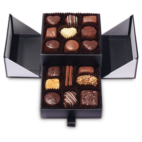 This elegant two-layer box opens to reveal a mix of rich truffles and soft centers, while a hidden bottom drawer slides out to unveil even more irresistible candies. Wrapped with a festive Valentine’s heart band, it’s a gift that’s as delightful to give as it is to enjoy. Approximately 18 pieces*: Milk Vanilla Buttercream, Milk Bordeaux™, Blueberry Truffle, Milk Butterscotch Square, Milk Molasses Chips (2), Milk Almond Caramel, Dark Raspberry Cream, Dark Scotchmallow®, Dark California Brittle®, Kona Mocha, Toffee-ettes®, Milk Butterchew®, Deep Dark Chocolate Truffle (2), Dark Chocolate Chip Truffle, Raspberry Truffle, Blueberry Heart Truffle. *If we run into shortages, we may make replacements or adjust piece counts. Don’t fret. You’ll always get an assortment fully filled with deliciousness.
